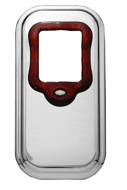 Peterbilt 379 Shift Tower cover. Chrome with a Rosewood collar. Made in the USA by Rockwood Products. Please see 2nd image for needed measurement.