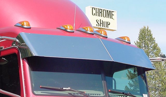 Peterbilt 379/389 blind mount visor (no bolt heads showing), 14.5" drop, fits ULTRA cabs, 2005+ with cab mounted mirrors, stainless. Made in the USA by Roadworks Mfg.