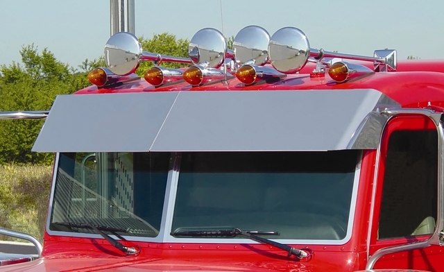 Peterbilt 379/389 STD cab, Blind mount visor (no bolt heads showing) with cab mounted mirrors, 13.5" drop, stainless. Made in the USA by Roadworks Mfg.