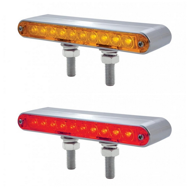 6-1/2", 10 led double face light bar. Amber with amber lens and red with red lens. Also available with a clear lens, which shines amber and red. Please refer to drop down list. Chrome plastic housing, 3 wire, double stud mounting. Import.