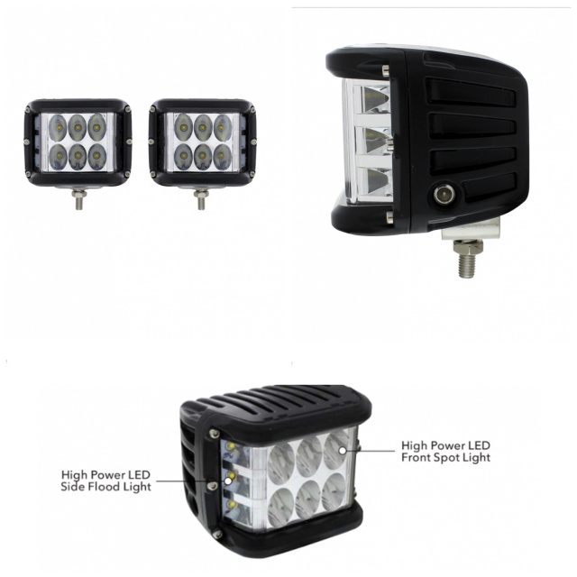9 high power LED driving/work light with side led - spot/flood light. 6 LED's at front - Spot light and 3 LED's at side - Flood light. Stainless steel mounting bracket and hardware. 2400 lumens. Sold as a PAIR