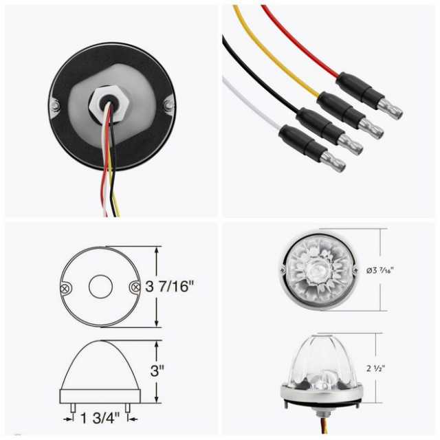 Glass marker light kit with a bright Double Fury 4 led installed. Wiring color code: White=ground (-), Black=primary low(+0, red=primary high(+), yellow=secondary. Secondary color will override primary when on. See drop down list for desired color combination.