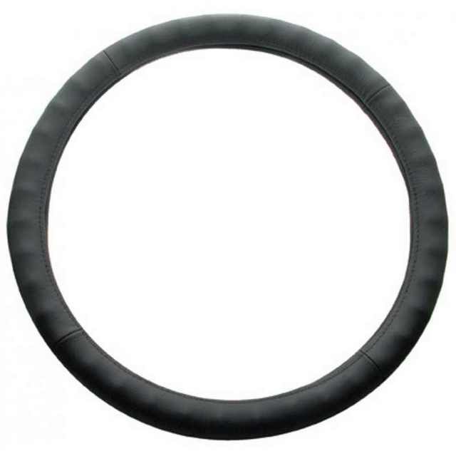 18" Leather steering wheel cover. Black. Sold as each. Installation tip: If conditions are cold, warm the steering wheel cover to room temperature, then carefully stretch the cover over the wheel.