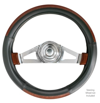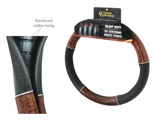 Heavy duty steering wheel cover. Fits 18" steering wheels. Extra thick padding for comfort. Durable rubber lining. Sold as each. Choose from dark PVC vinyl wood with smooth leather, or dark PVC vinyl wood, smooth leather AND CHROME TRIM (second image). Please see dropdown list.