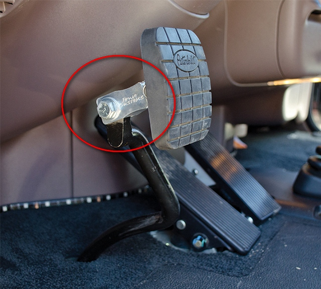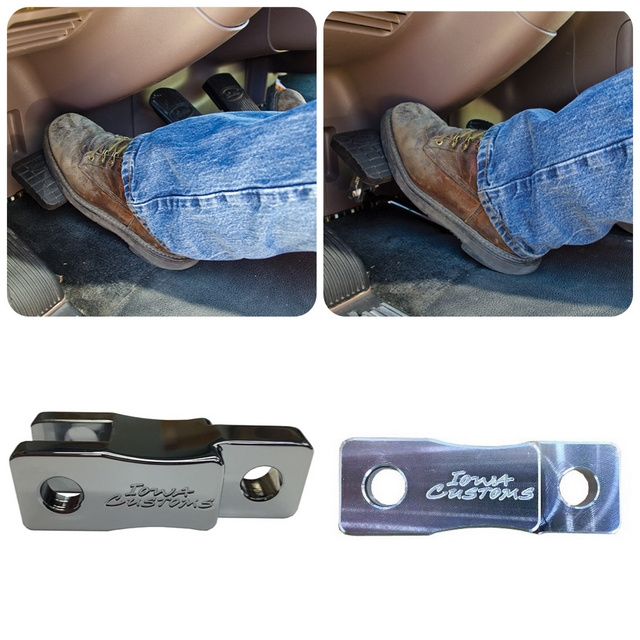 Clutch pedal extender. Want to improve driver ergonomics? Let the clutch pedal extender help improve your driving position. The patented design changes the position and angle of the clutch pedal to help you better disengage the clutch. This dramatically changes the foot angle as depicted in the photo. Perfect for folks who have moved their seat position. Available in Billet Aluminum for $82.00 and Chrome finish for $121.00. Designed for Peterbilt. Made in the USA by Iowa Customs.